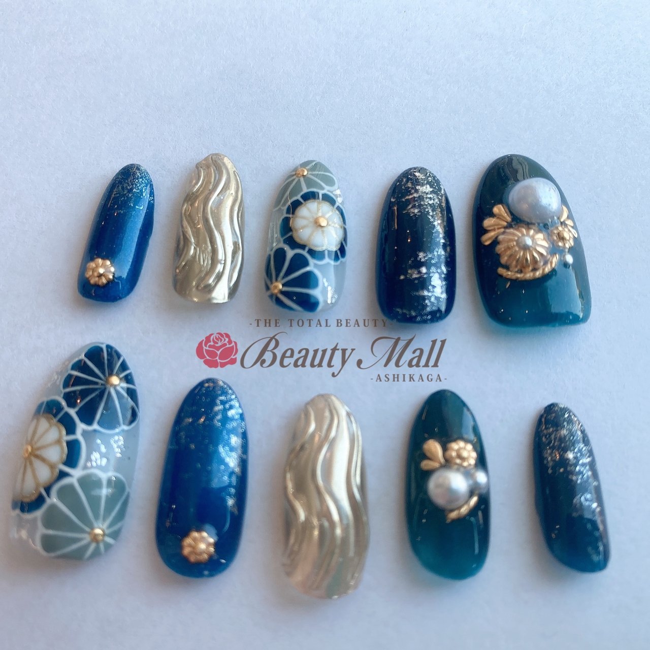 ハンドメイド ジェルネイルチップ 和柄ネイル青 成人式にも